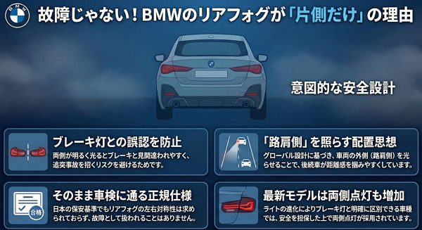 BMWに乗っていて、ふとリアを見たときに「リアフォグ、片側しか点いていないけど壊れているのでは?」そう感じた経験がある人は少なくありません。