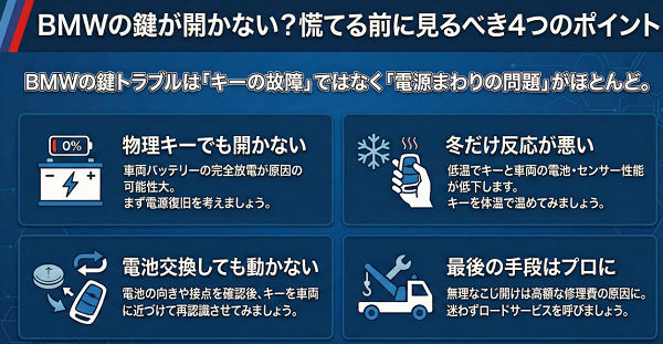 BMWの鍵が開かない原因と対処法|バッテリー上がり・スマートキー不調を網羅解説