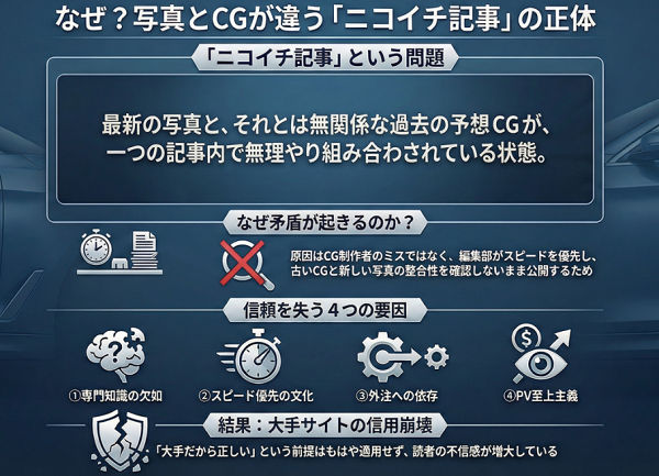 それでも記事は、何事もなかったかのように公開され、大手自動車専門サイトの看板の下で拡散されていく。
